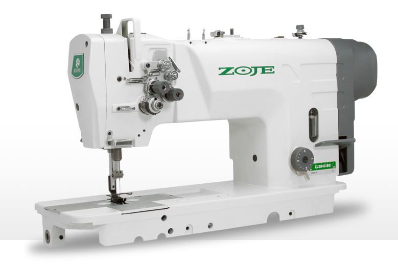 Pespontadeira Zoje 2 agulhas barra fixa com sistema automático de parada de agulha e transporte duplo por dente e agulha.